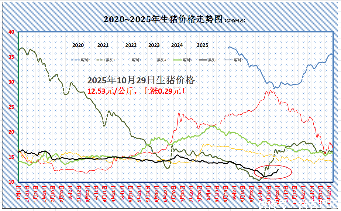 据数据显示,截至10月29日,外三元瘦肉型标猪出栏均价涨至12.53元/公斤,环比前一日上涨0.29元/公斤,市场呈现单边上涨的走势,最近两日累计上涨达到0.58元/公斤,相比此前低值,月内猪价累计上涨超13.7%,猪价重返“6元时代”!