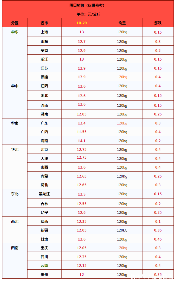 从分区来看,10月29日,全国生猪市场,在重点数据监控的28个地区,屠企报价延续全面上涨的走势,主流生猪报价回升至12~13元/公斤,猪价重心上移,区域缺乏明显价差,南北市场,猪价呈现携手上涨的走势!
