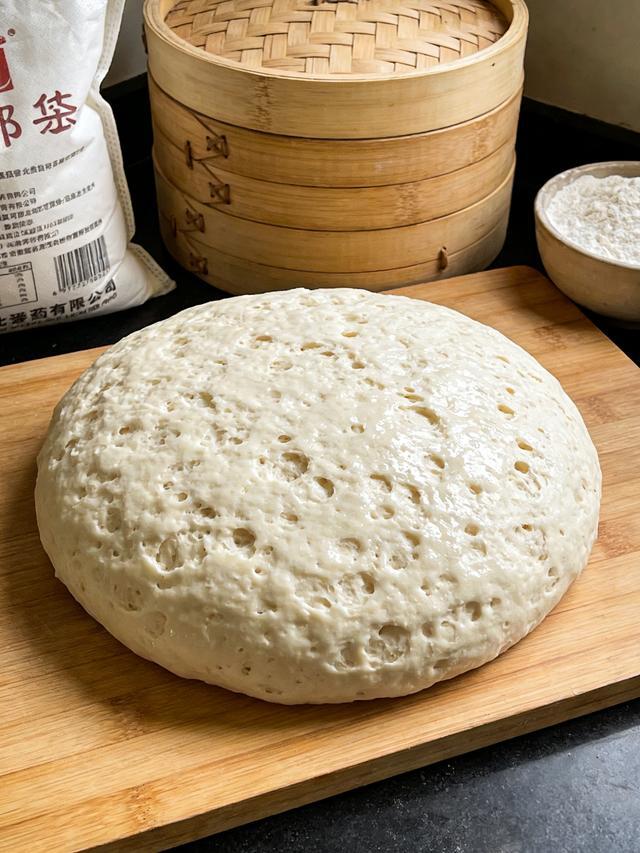5. 发酵好的面团会变得特别蓬松,用手一扯全是密密麻麻的气孔,摸起来黏手,还带着一股淡淡的酸香味。这一步是“养面”的关键,菌群数量越多,后续面团发酵得就越快,馒头的口感也会更暄软。