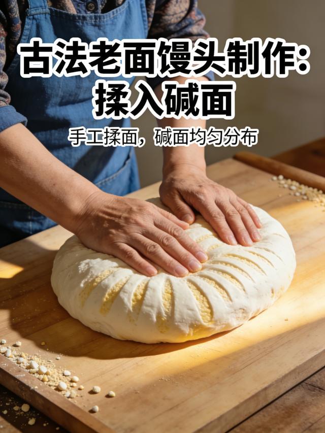 9. 案板上撒一层干面粉防粘,抓一小撮食用碱面撒在面团上。碱面的用量要根据面团的酸度来定,宁少勿多,它的作用就是中和老酵子发酵产生的酸味。